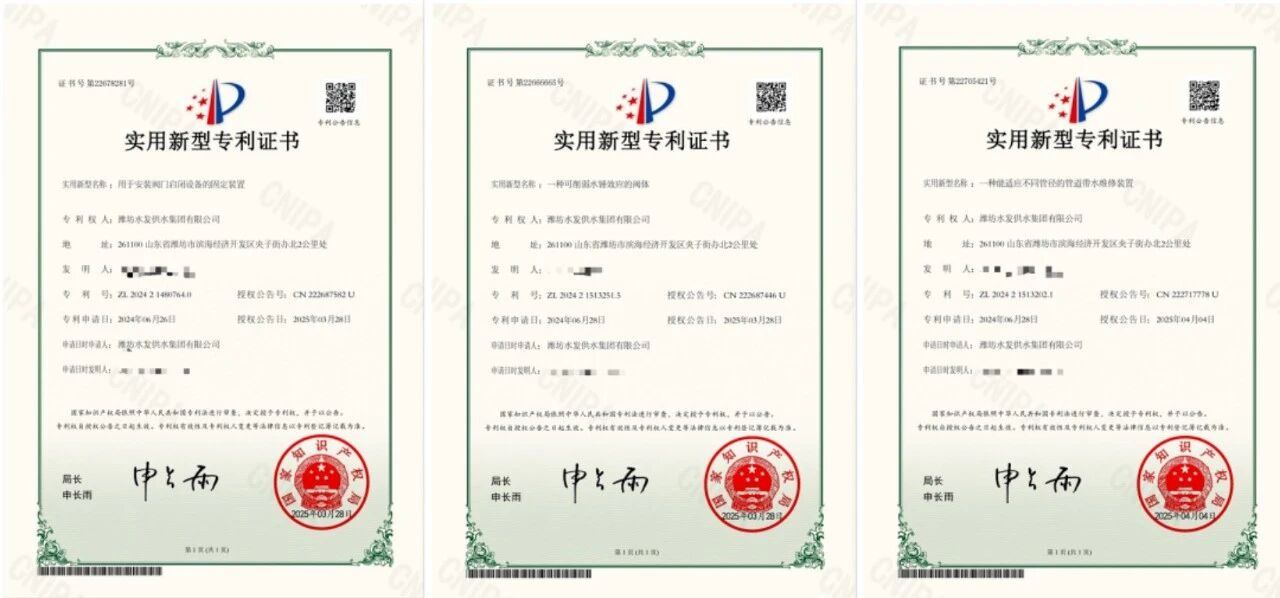 此外,濰坊區(qū)域還新增3項實用新型專利,涵蓋設備安裝、系統(tǒng)防護與維修維護等多個應用場景:《用于安裝閥門啟閉設備的固定裝置》提升了復雜環(huán)境下的施工效率;《一種可削弱水錘效應的閥體》增強了供水系統(tǒng)穩(wěn)定性;《一種能適應不同管徑的管道帶水維修裝置》實現(xiàn)了高效不停水維修。三者與前述發(fā)明專利、軟著協(xié)同發(fā)力,初步構(gòu)建起“檢測-控制-維護”的水務管網(wǎng)技術創(chuàng)新體系。